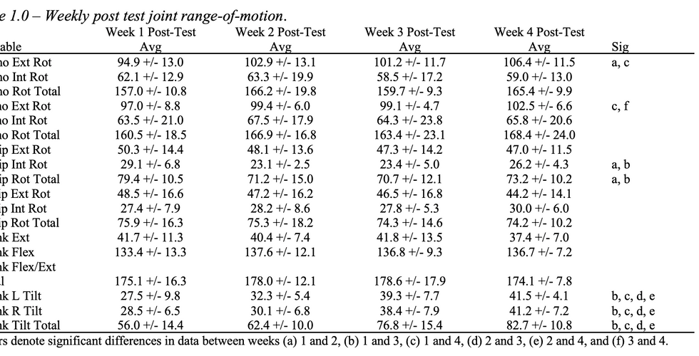 Actively doing yoga on a regular basis really seems to allow the shoulders and spine to become more mobile, and not just right after class (it does that too). What we saw in this study was a long term chronic adaptation of the shoulders and spine becoming more mobile. In elite sports, this is very important. Athletes are always chasing ways to become more mobile. Their mobility always declines after large spikes in workload (see our 2019 study here), and their mobility declines over a season from chronic fatigue (Camp et al). Spending the time to recover and gain that mobility back is paramount to an athlete’s ability to stay healthy—and that’s what the best do.